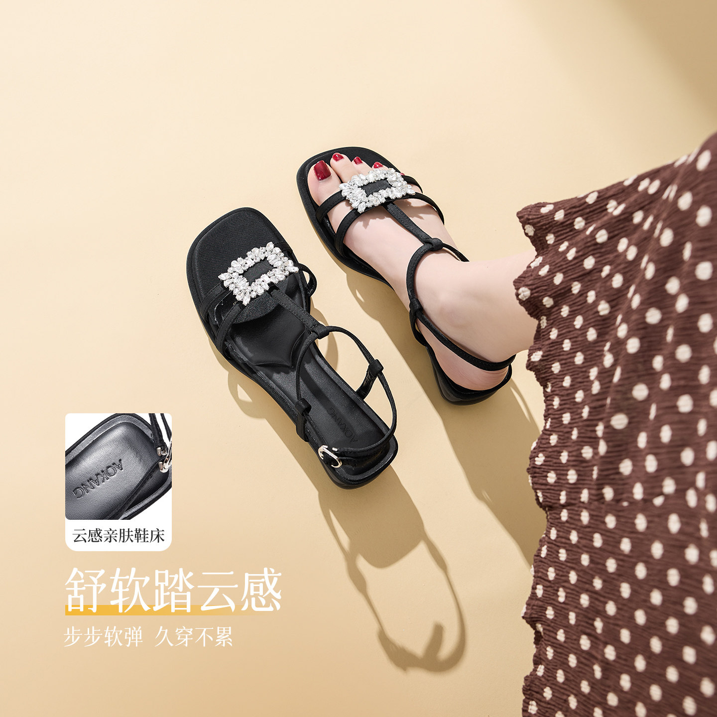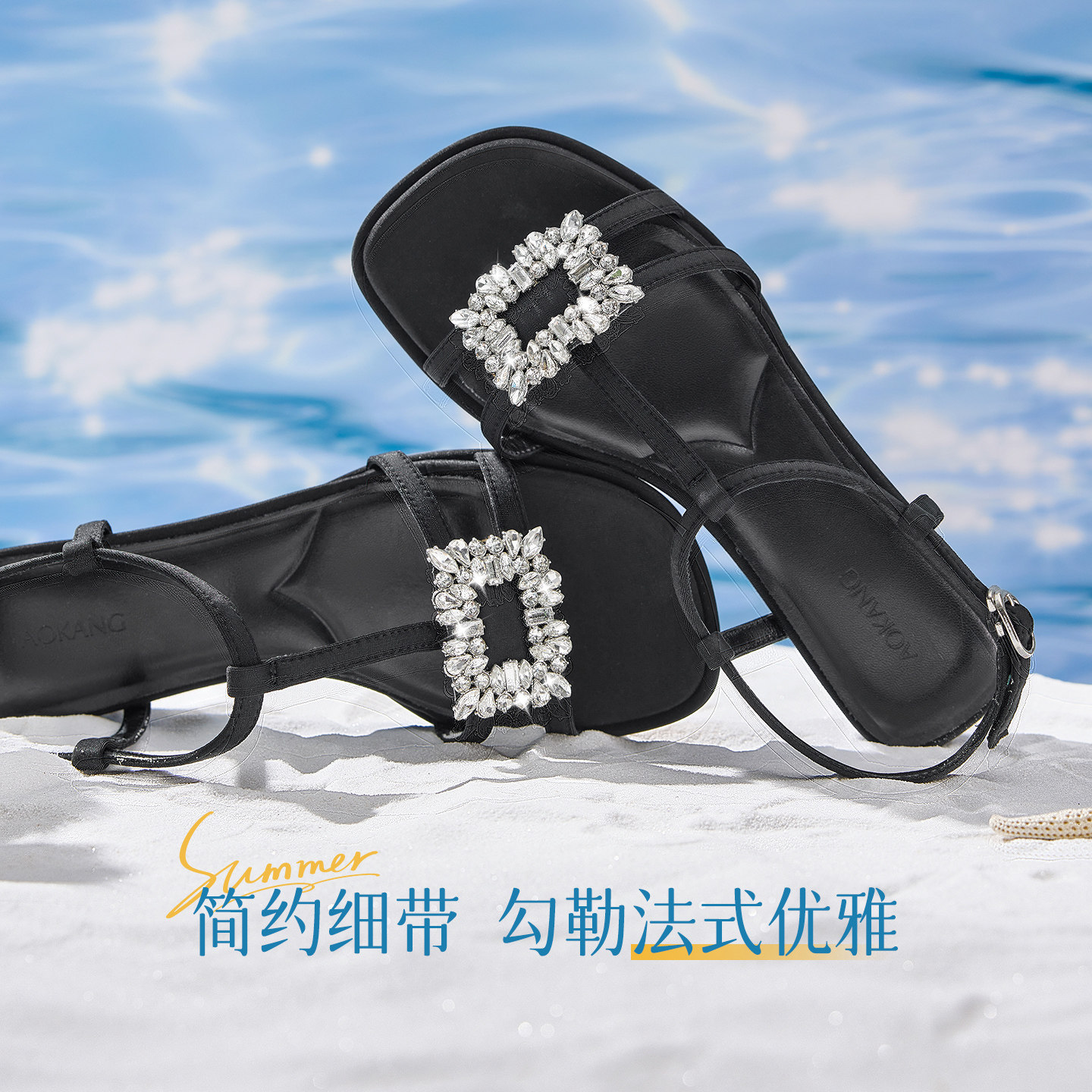 奥康 女鞋夏季新款法式拖鞋外穿绝美凉鞋细带水钻方扣粗跟配裙子