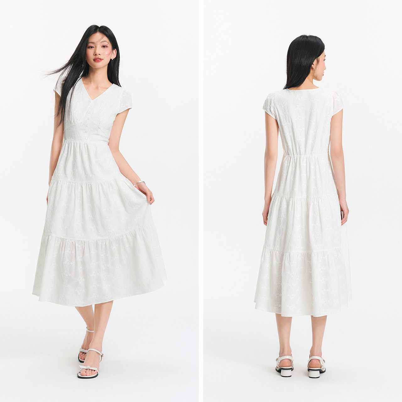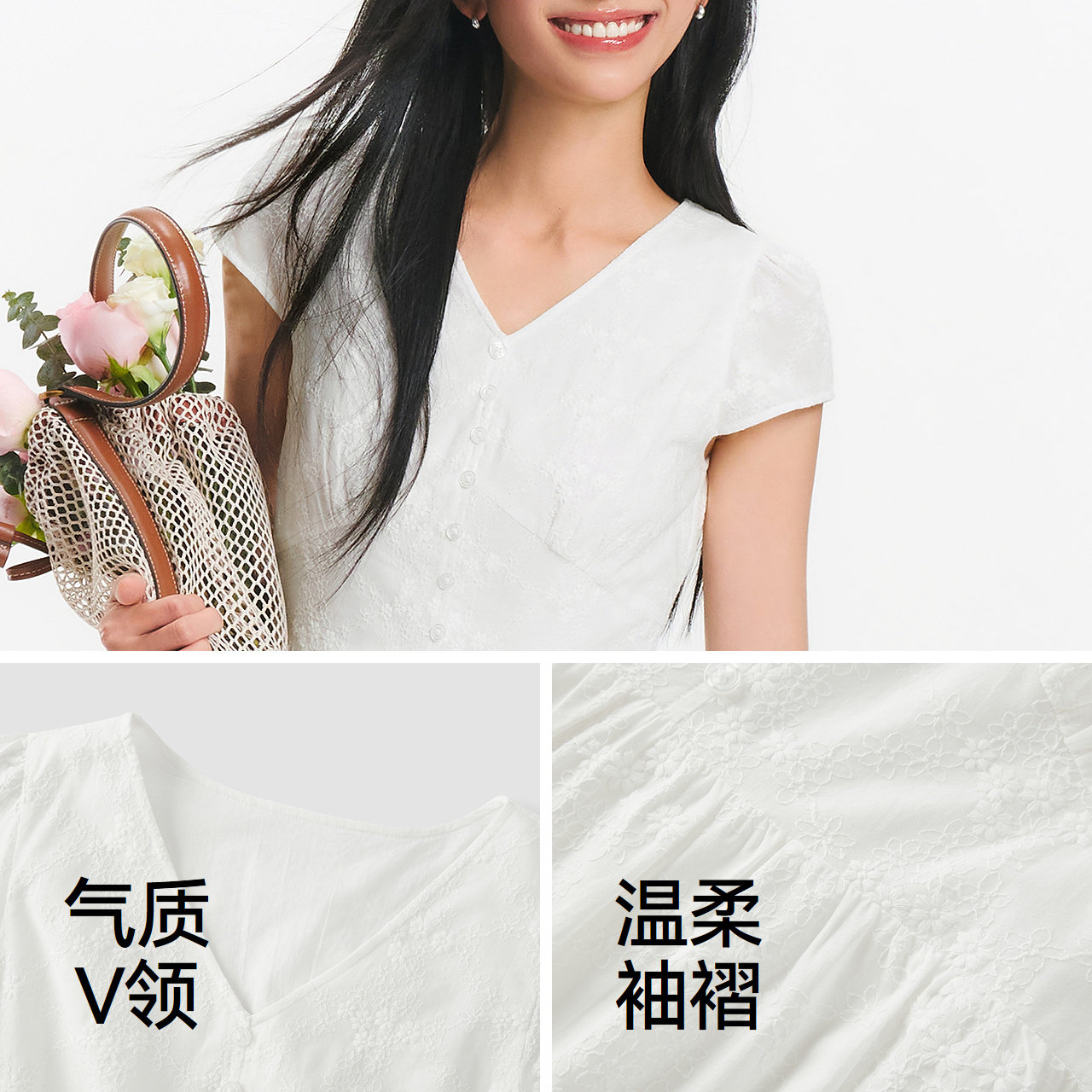森马连衣裙女夏季重工绣花V领小白裙甜美温柔气质度假风初恋长裙