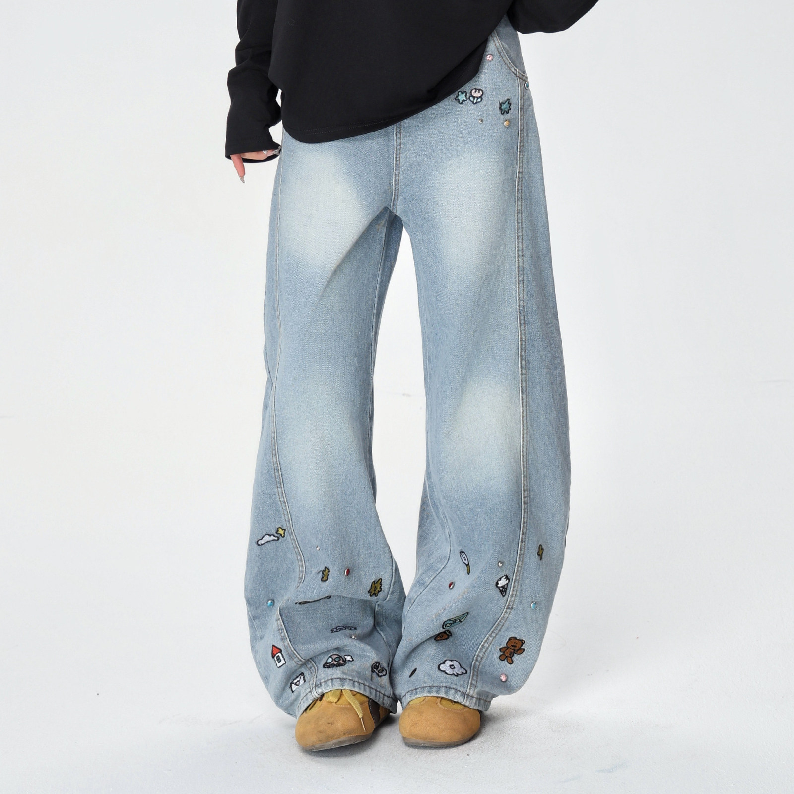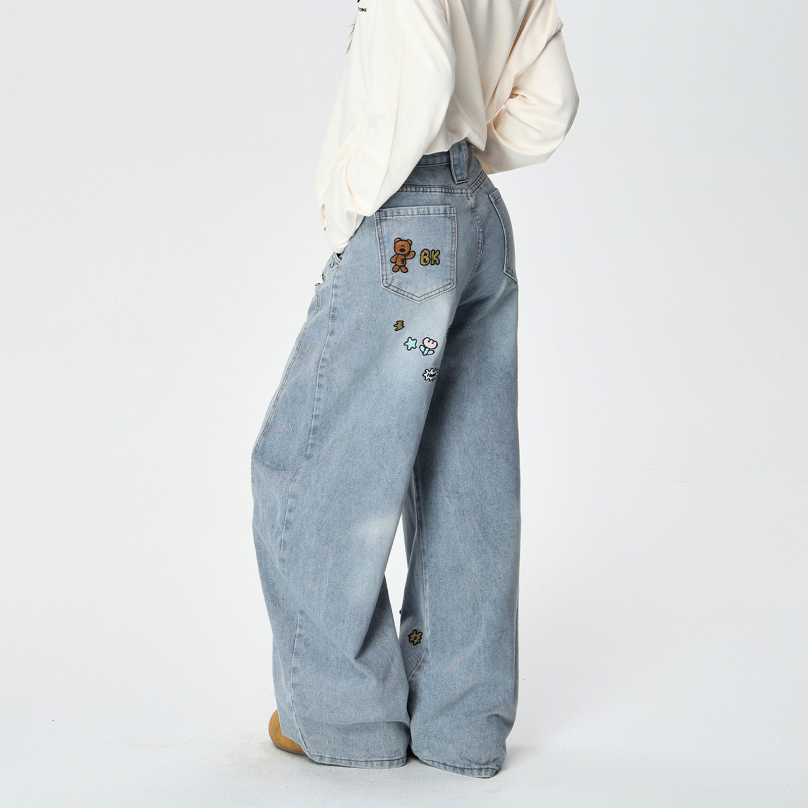 王安宇同款森马牛仔裤男做旧复古阔感弯刀裤宽松弧形裤2025冬新款