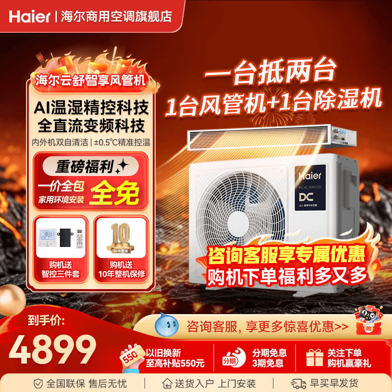 海尔风管机3匹4匹一拖一客厅家用智享版一级能效中央空调旗舰店