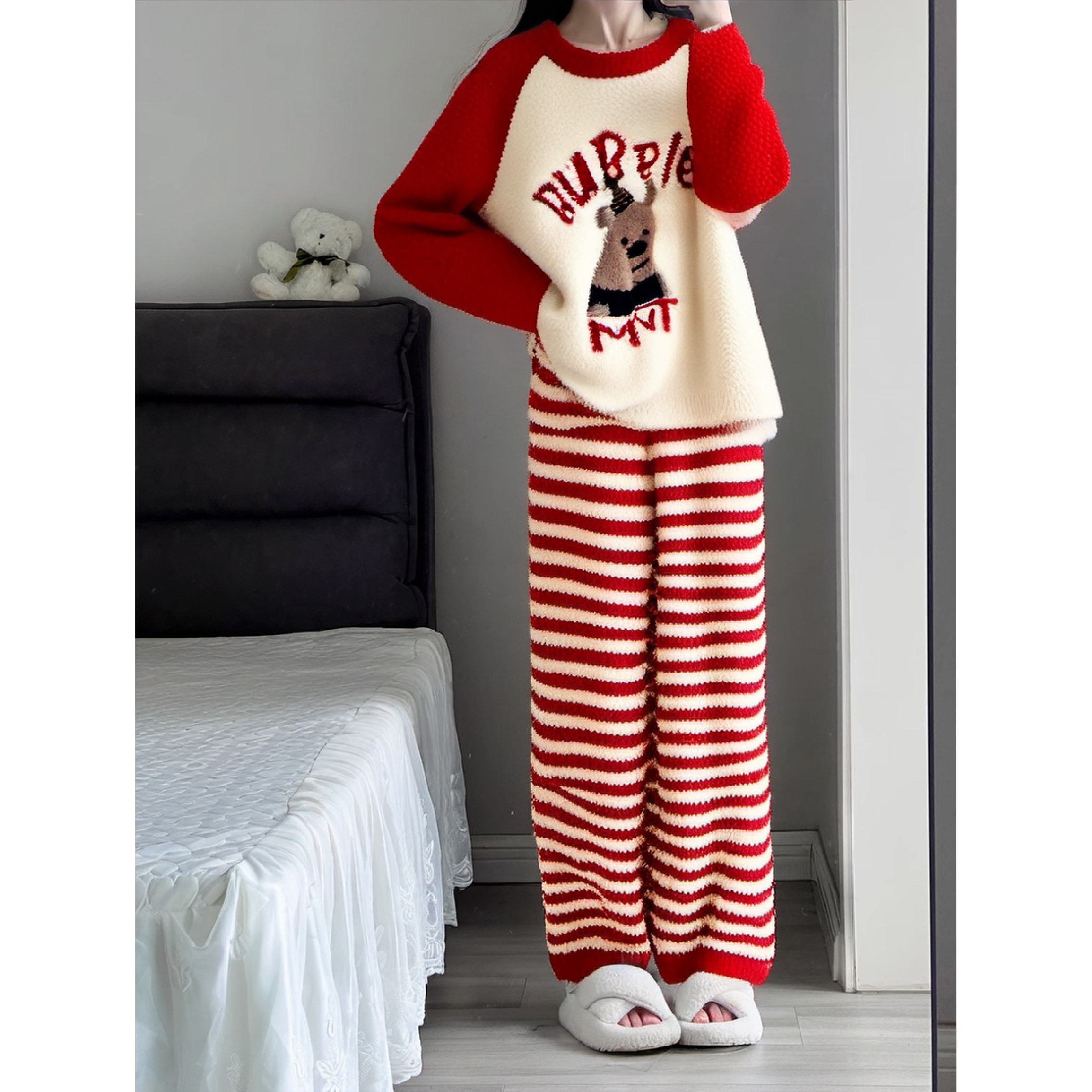2025新款睡衣女秋冬季新年红字母小熊加厚半边绒条纹珊瑚绒家居服