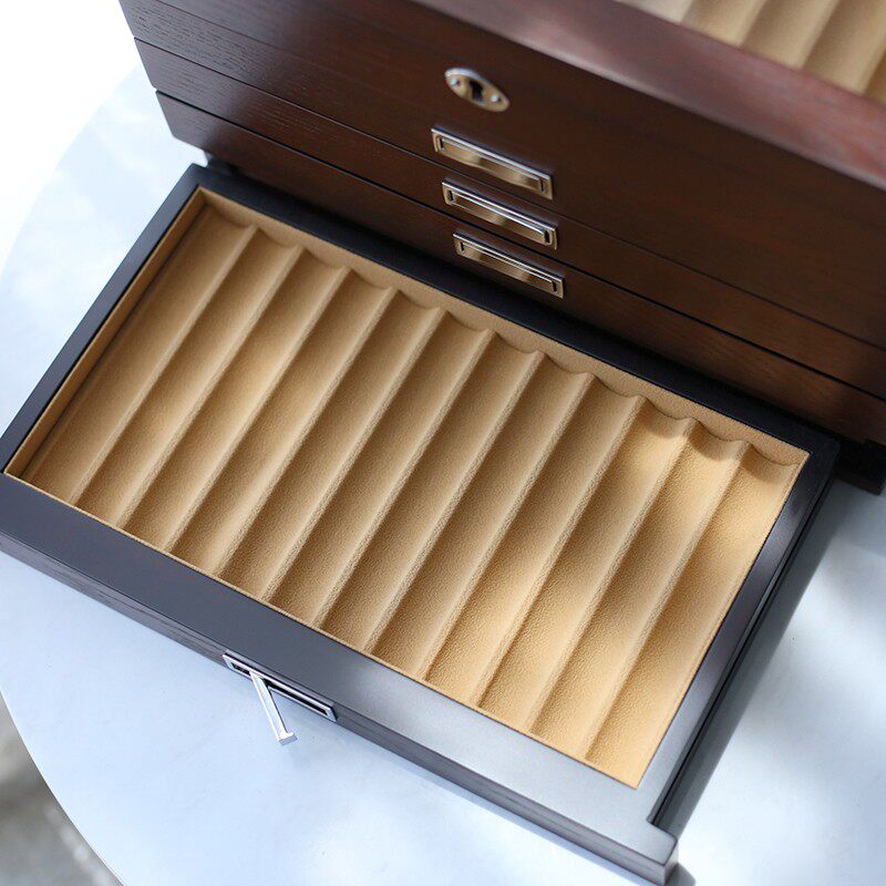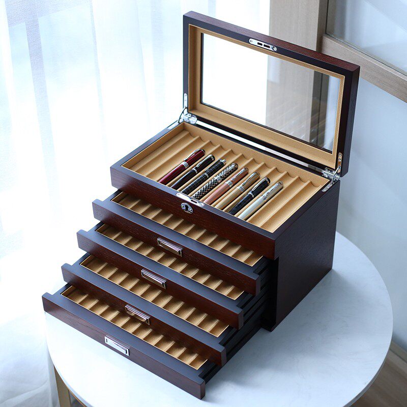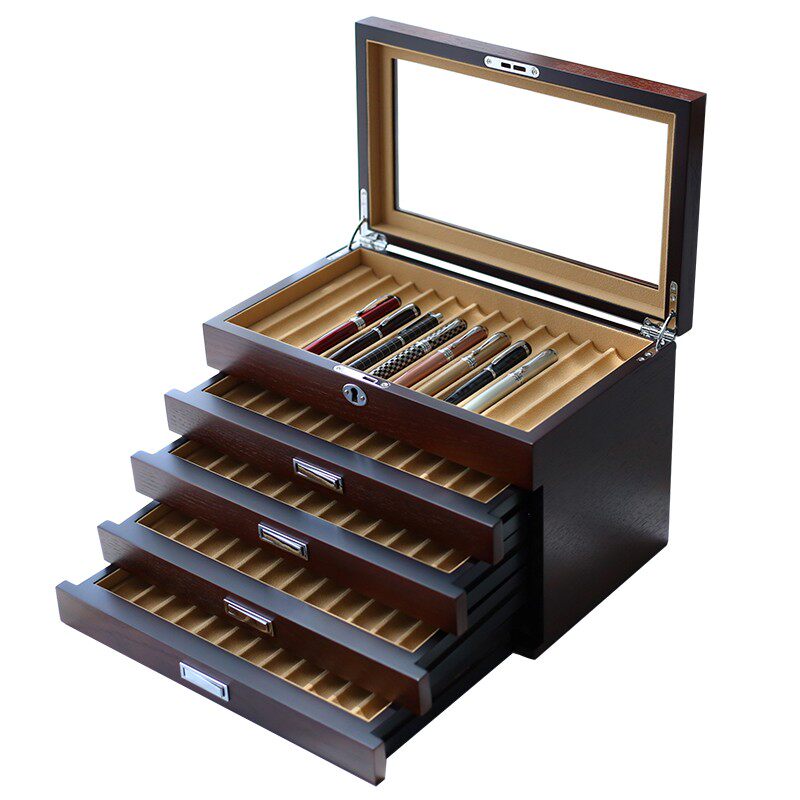 木质高档钢笔盒收纳展示柜大容量名笔收藏箱绒布内衬60支装陈列盒
