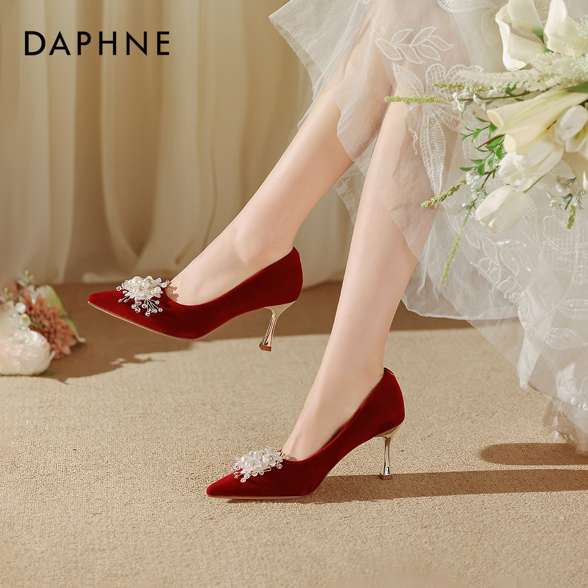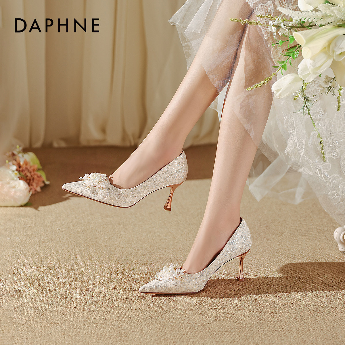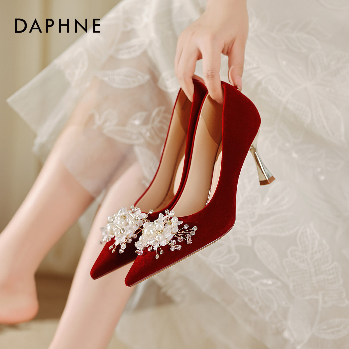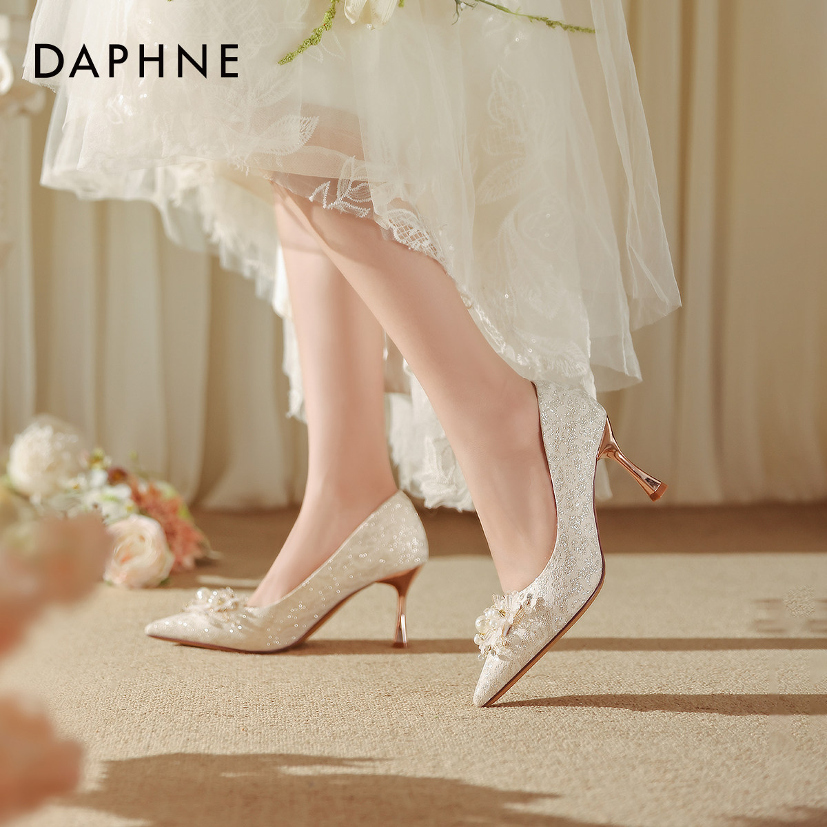 达芙妮高跟细跟女鞋子2026新款香槟色秀禾婚纱婚鞋新娘尖头单鞋秋