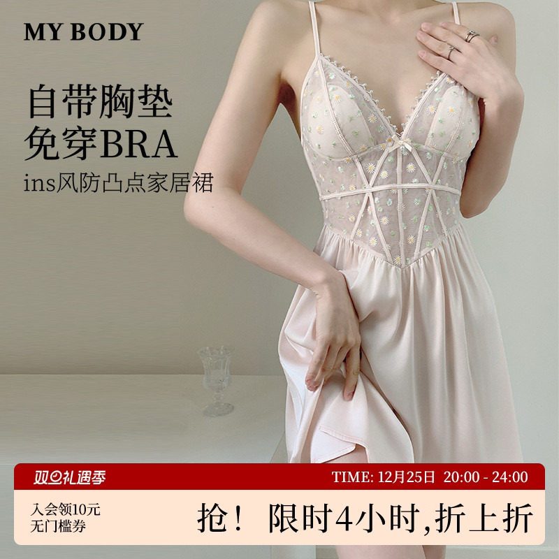 MYBODY商场同款吊带睡裙女带胸垫性感纯欲禁欲系露背蕾丝网纱睡衣