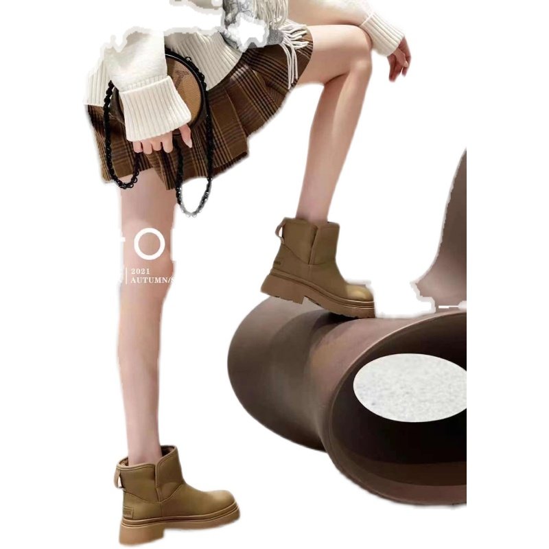牛皮~骄屿复古圆头雪地靴加绒保暖毛毛棉靴两穿平底棕色勃肯短靴