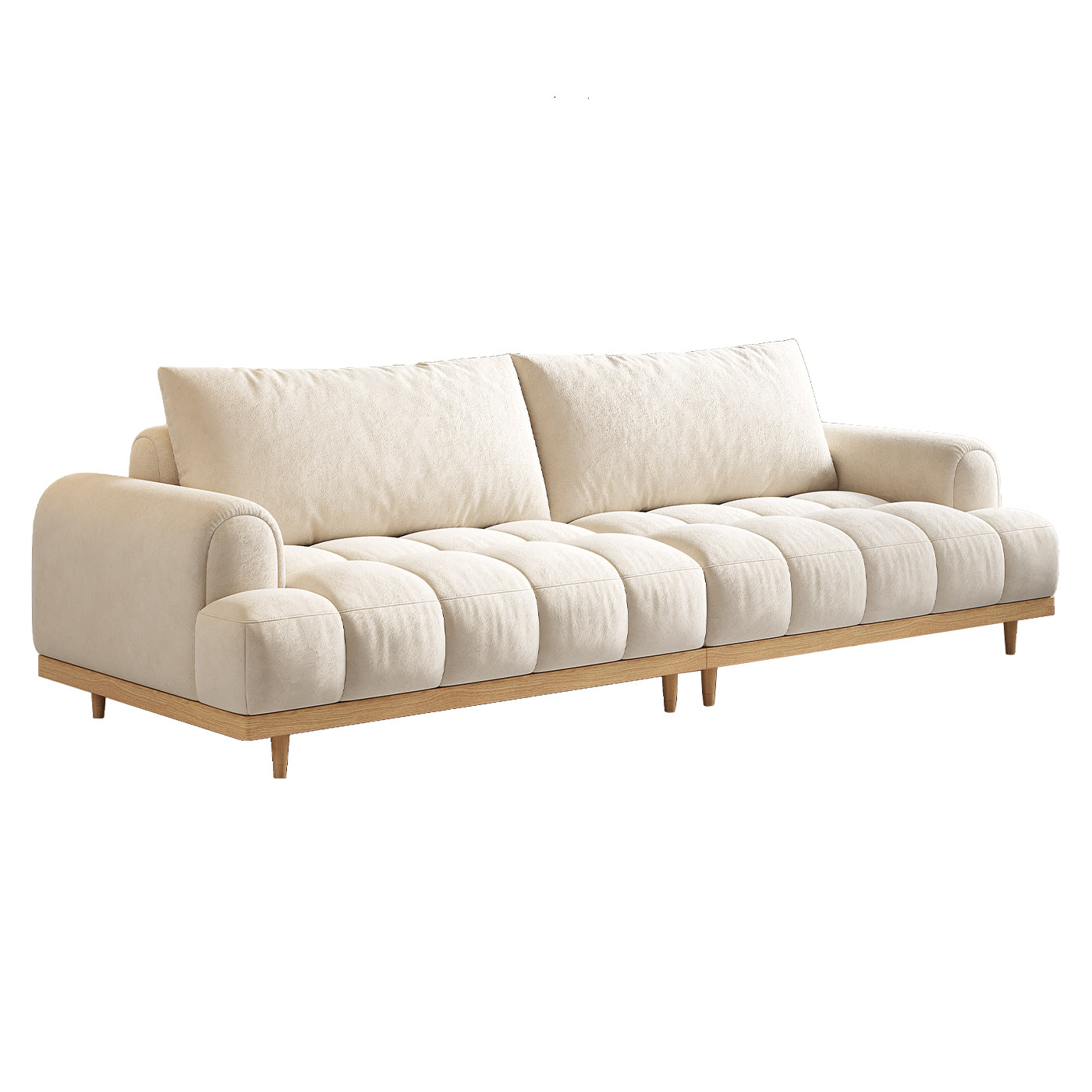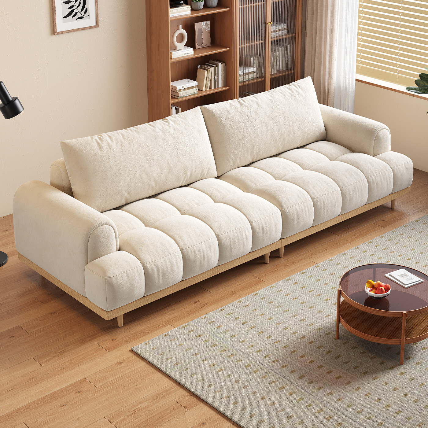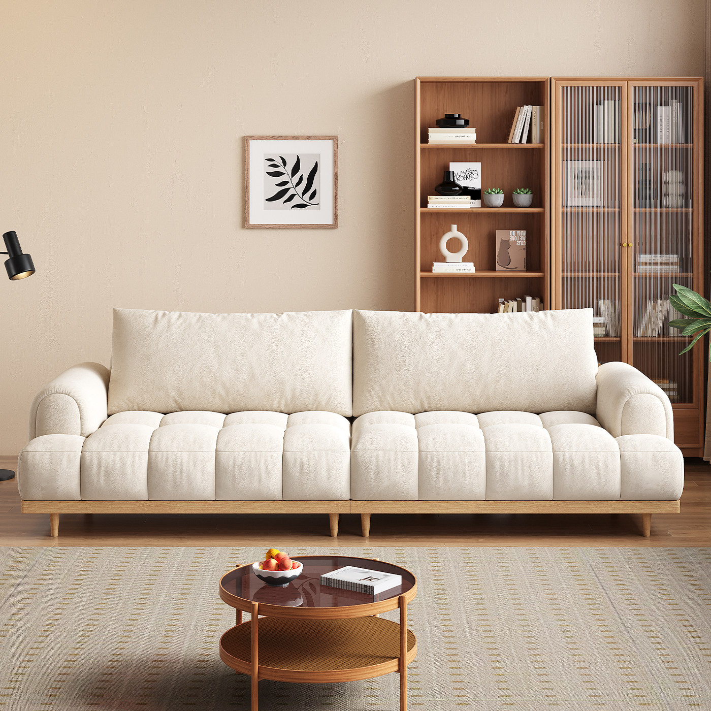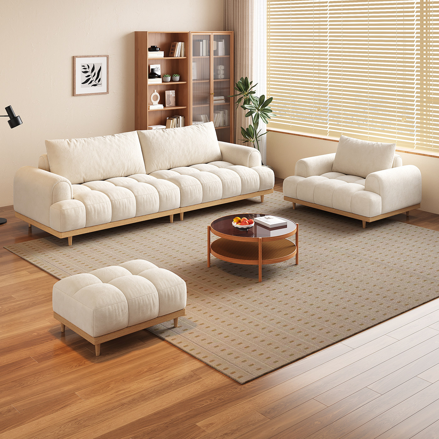 司朴原木风布艺沙发现代简约奶油风直排钢琴键实木三人位云朵沙发