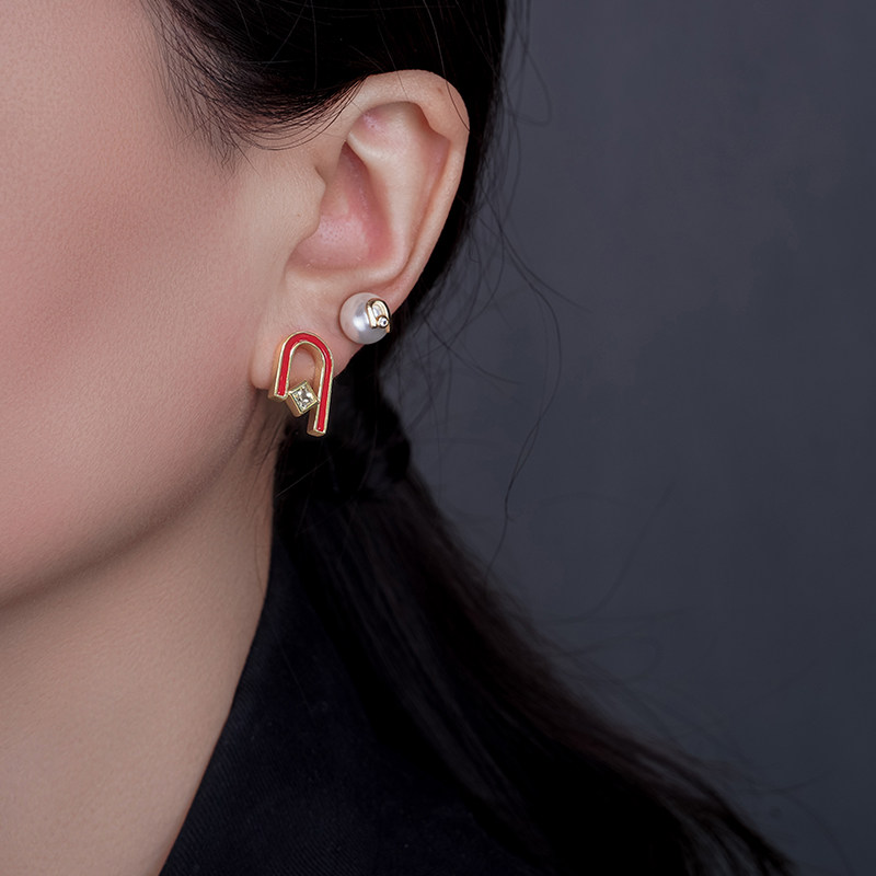 银针红色耳钉精致时尚方形满钻耳环简约设计个性耳饰秋冬新款韩国