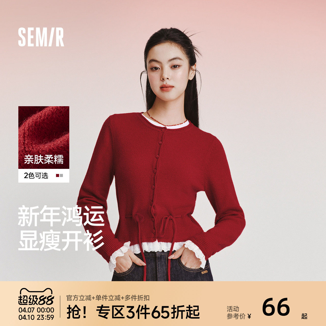 新年红 森马针织开衫女春红色毛衣蕾丝收腰2026新款新年甜美上衣