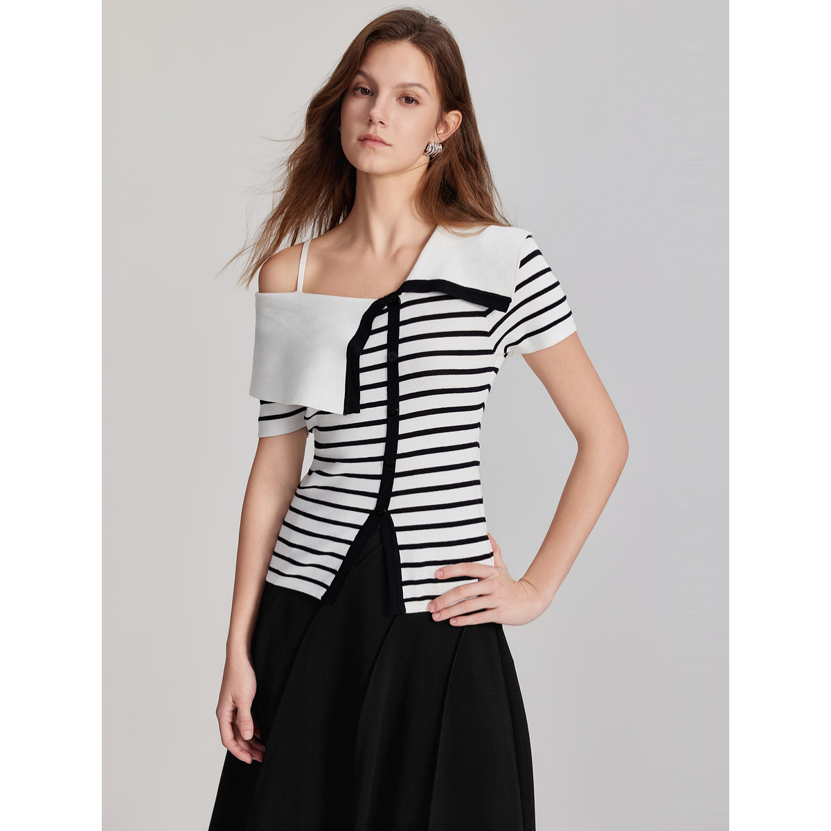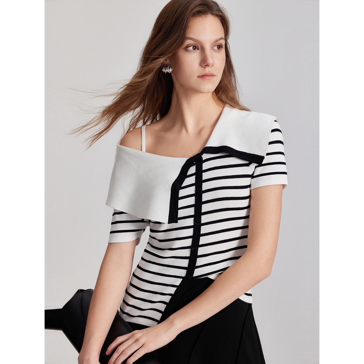 ELLE2025夏新款法式高级感条纹V领毛针织衫女大翻领薄款小众毛衣