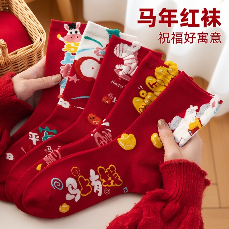 2026马年本命年红袜子女款中筒袜秋冬季新款男情侣新年保暖长袜