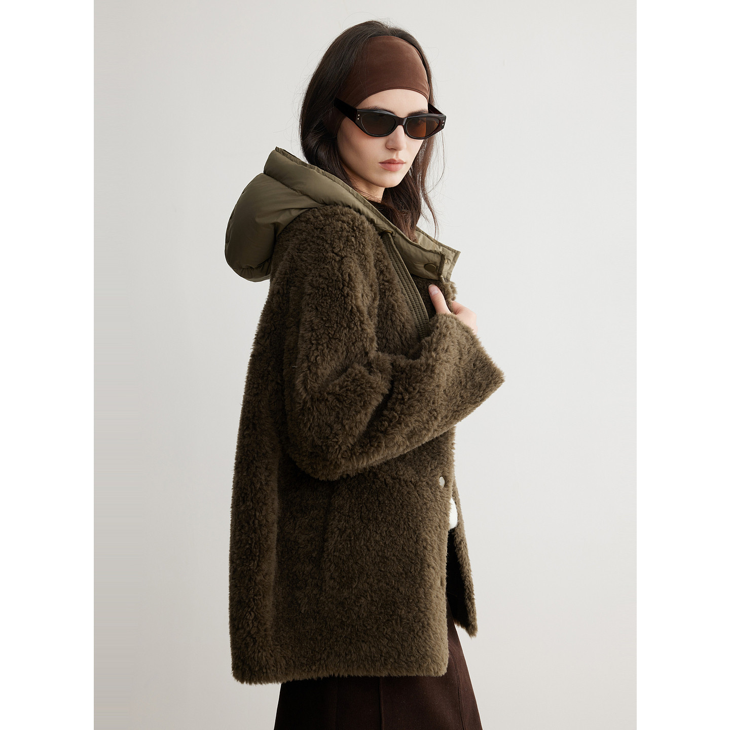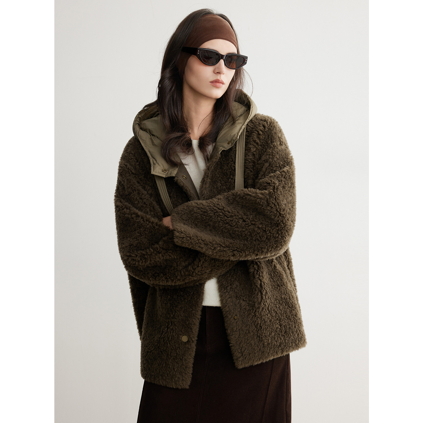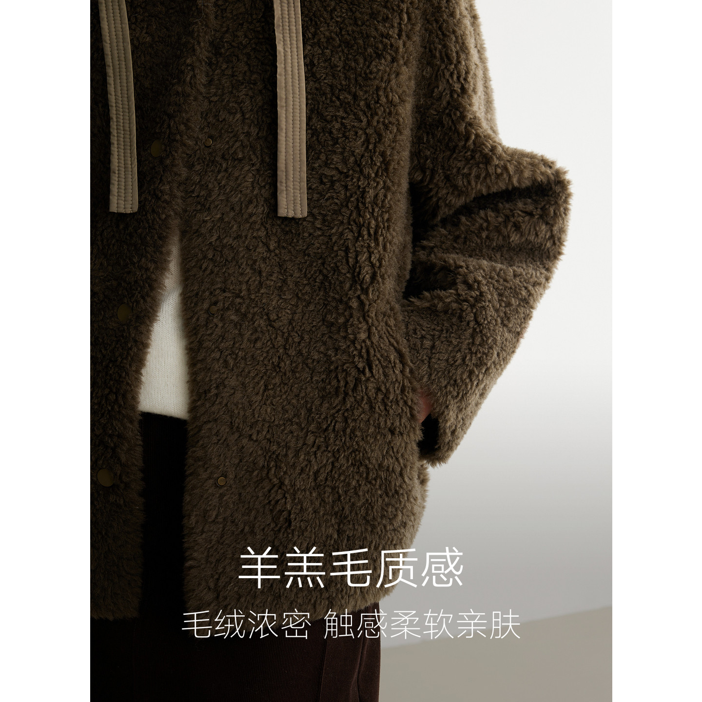 ELLE设计感连帽拼接羊羔毛短外套女2025冬新款仿皮草毛绒宽松上衣