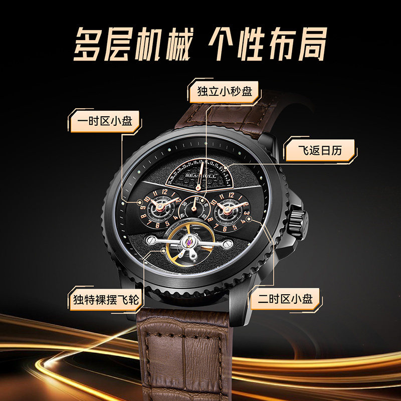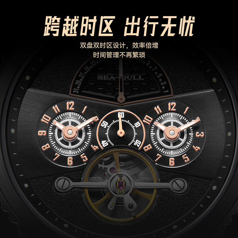 海鸥表双时区飞返手表男士多功能飞轮表夜光自动机械表6172