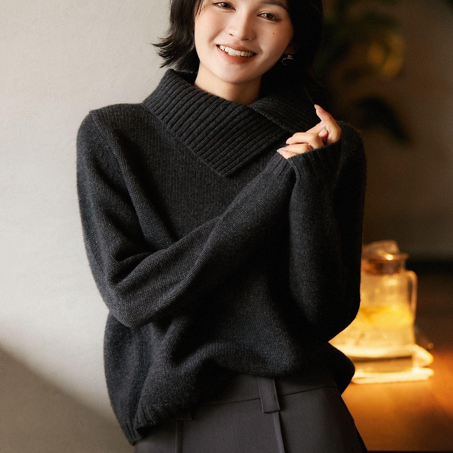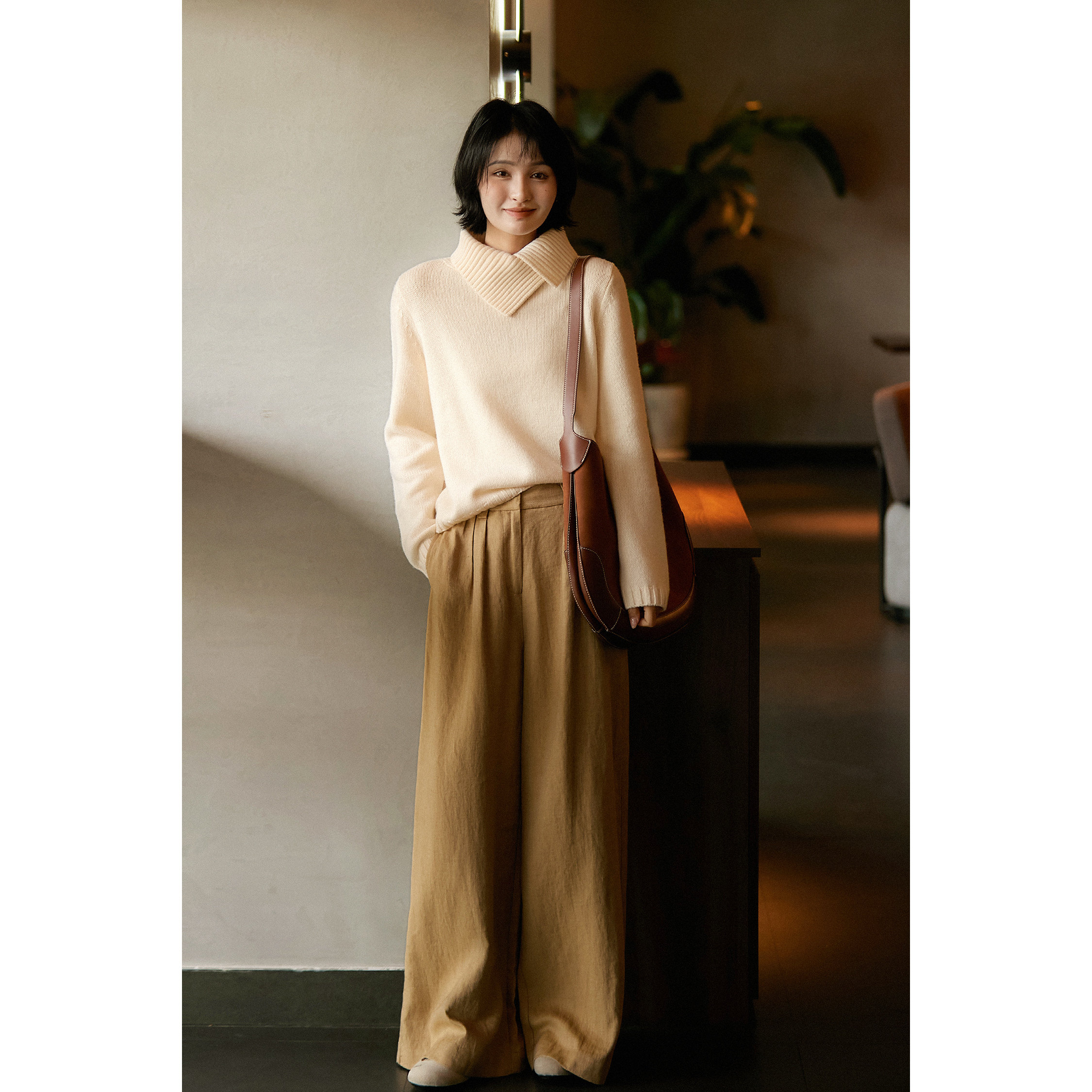 100%纯棉不规则法式翻领秋冬毛衣设计高领新款宽松气质针织衫上衣