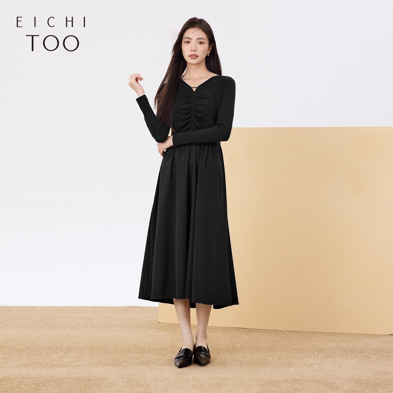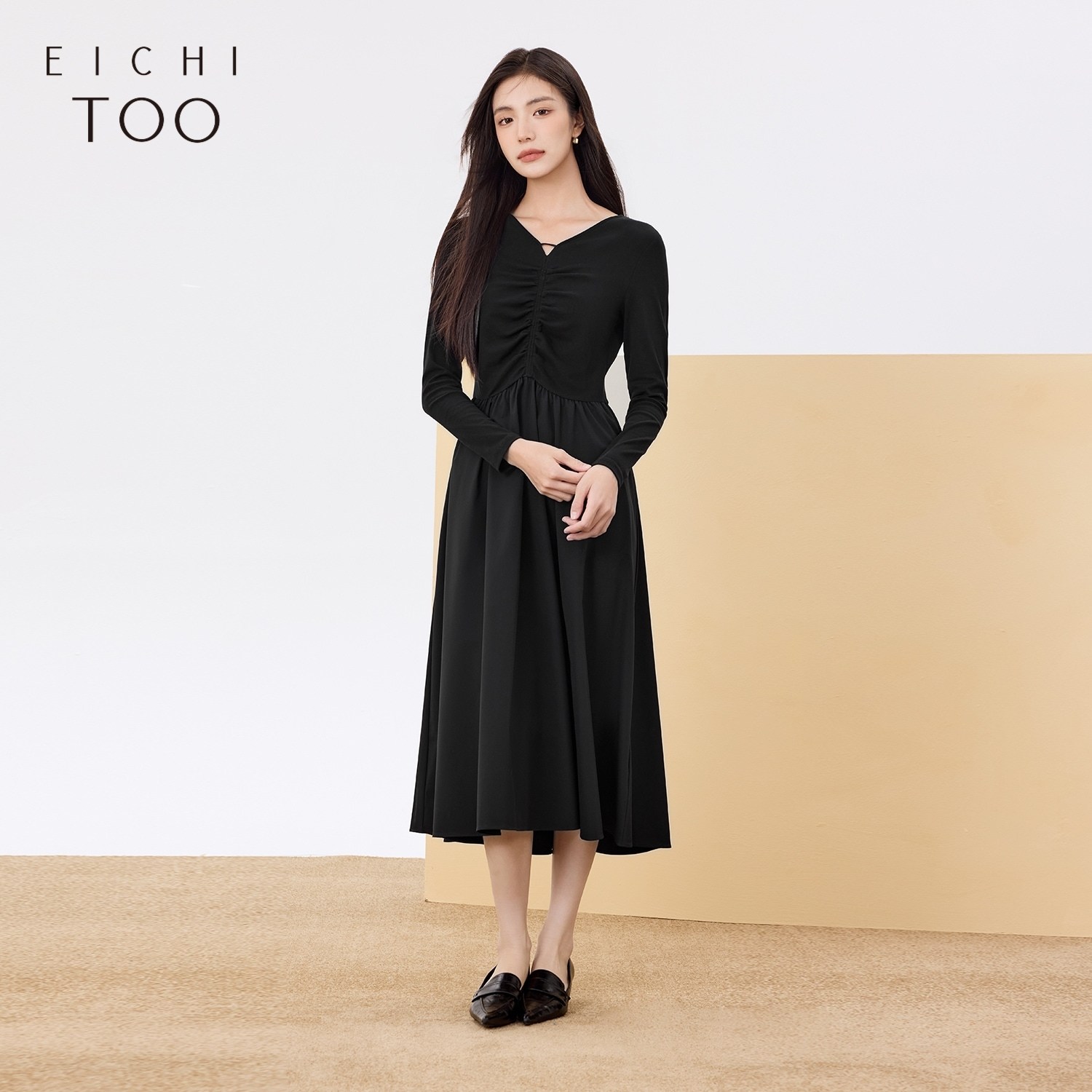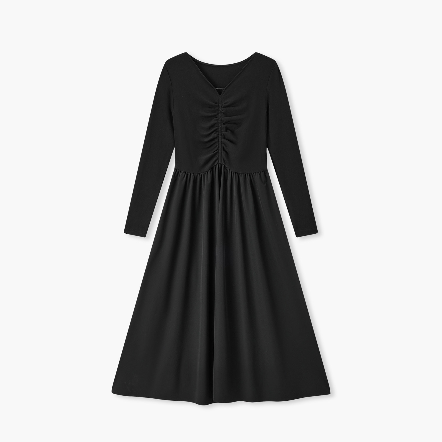 爱居兔赫本风小黑裙春秋新款v领抽褶收腰A字针织连衣裙长裙