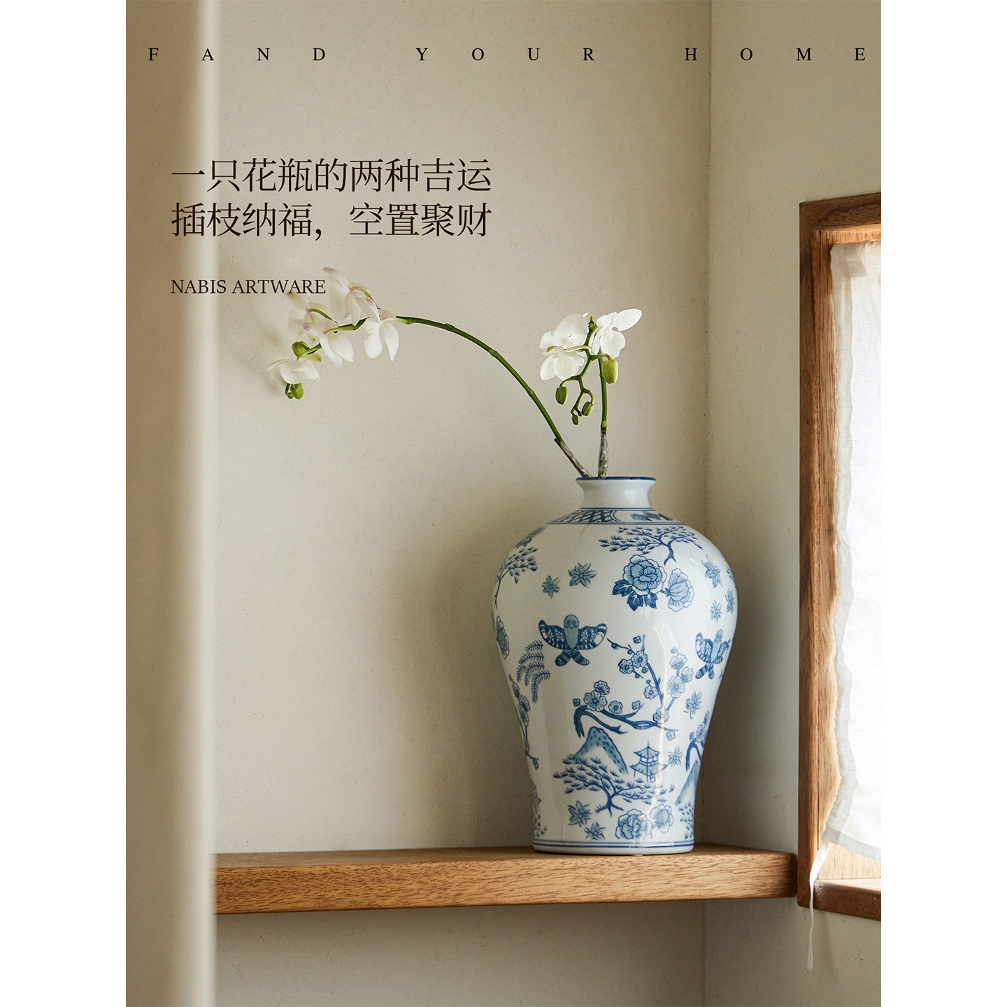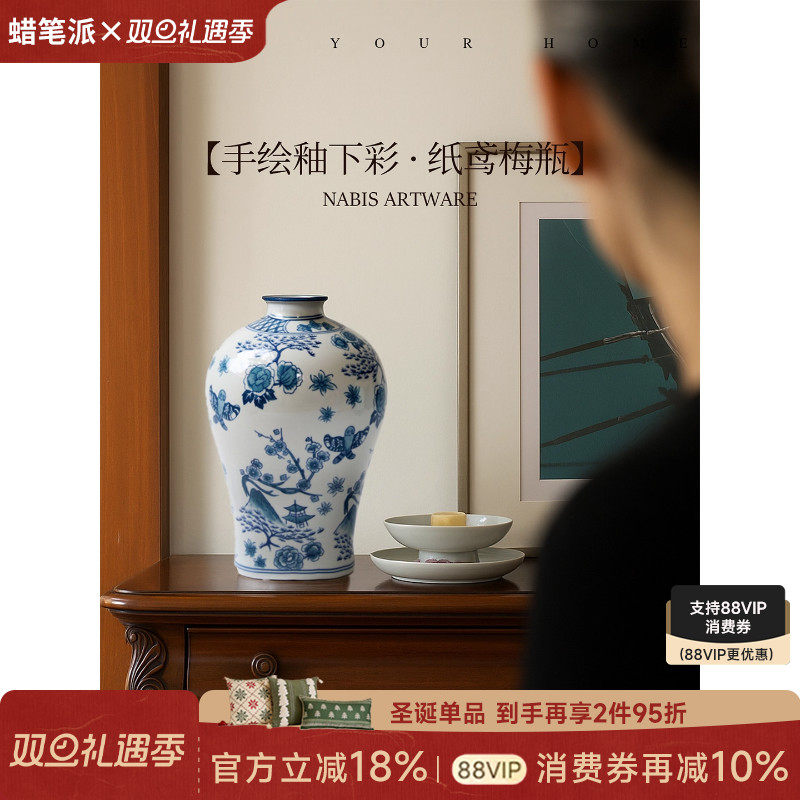 蜡笔派“鸢舞”手绘淡青花瓷花瓶复古玄关陶瓷高级摆件花器送礼