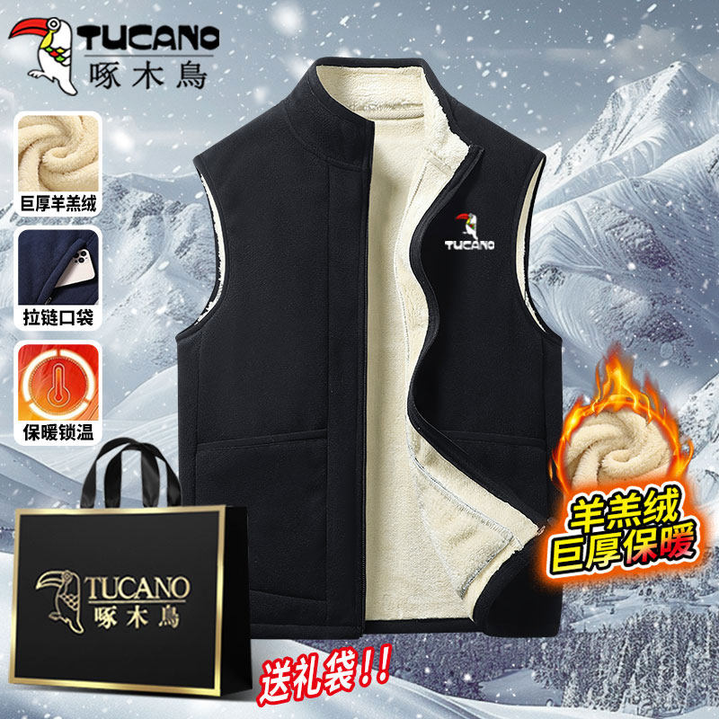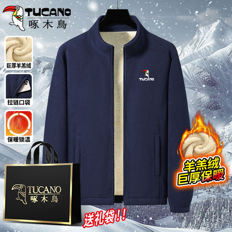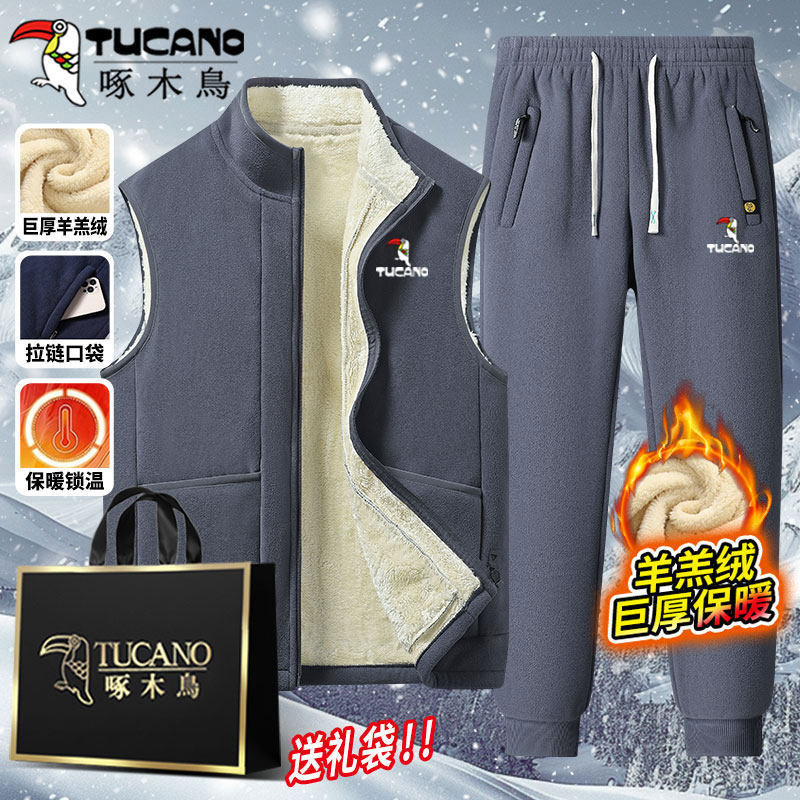 啄木鸟冬季羊羔绒运动套装男爸爸装休闲外套马甲加绒保暖2/3件套