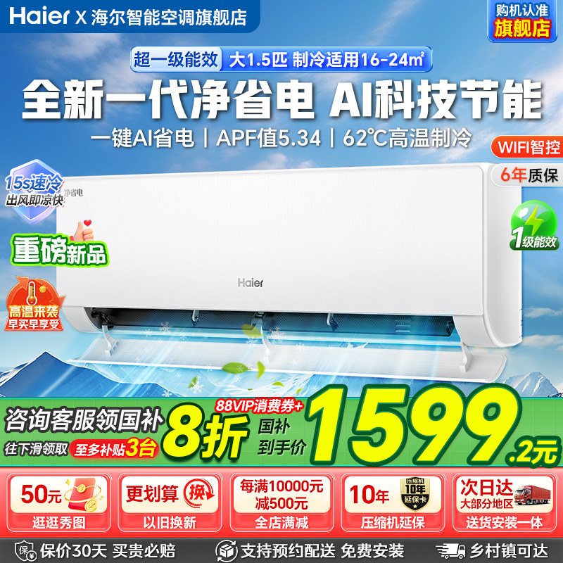 海尔智能空调旗舰店提供的海尔净省电1.5匹变频空调,售价在1799元左右,满0元减0元。所属门类:空调。备注:政府补贴15%海尔空调净省电1.5匹一级能效变频冷暖家用空调挂机 ...... 查看全文